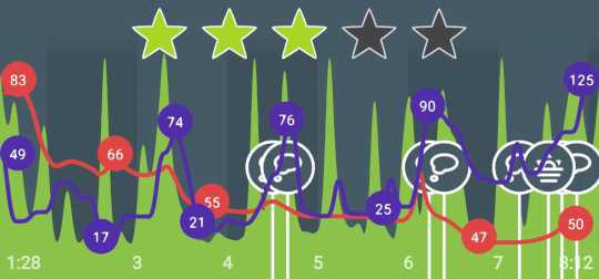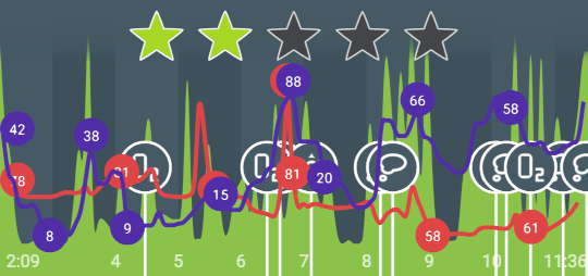 Apart from the heart rate (red line), the sleep record detail chart is now showing a violet line, depicting HRV development throughout the night. Each point on the violet line represents HRV (SDNN, in particular) for a 5-minute interval.
